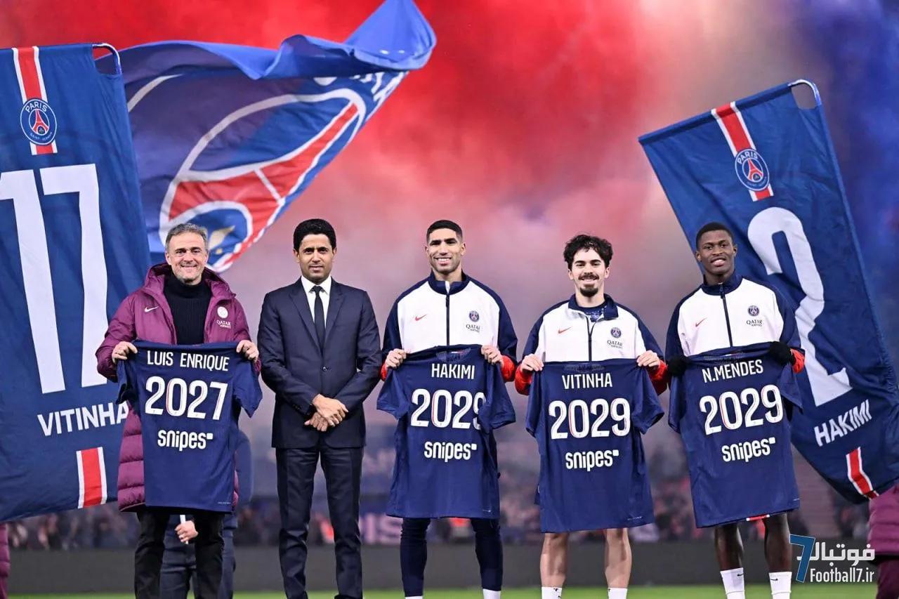 باشگاه پاری سنژرمن، دیروز پیش از بازی با موناکو، یک مراسم تمدید قرارداد داشت! لوییز انریکه سرمربی اسپانیایی پاریسیها، تا 2027 تمدید کرد. اشرف حکیمی، ویتینیا و نونو مِنجِز نیز همگی تا 2029 تمدید کردند. یوآم زاگه دفاع راست جوان فرانسوی نیز که فرد کمتر شناختهشده این جمع بود، تا 2028 تمدید کرد. زاگه 18 ساله دفاع راست تیم ملی زیر 19 سالههای فرانسه است و سرمایهای برای آینده محسوب میشود. 2 بازیکن آکادمی نیز نخستین قراردادهای حرفهای خود را با باشگاه امضا کردند.